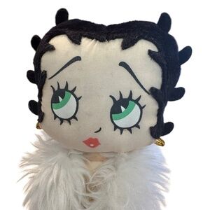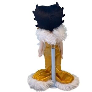 This 12.5-inch Betty Boop doll from the 2003 Holiday Collection by Applause adds a touch of vintage charm to any collection. She is dressed in a golden gown and a white faux fur stole. This doll features her signature green eyes and timeless style. A must-have for Betty Boop enthusiasts!