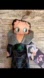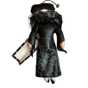 Visualize a charming Halloween doll adorned in a sleek black dress, elegantly tailored with accents of vibrant orange and green sliders. The dress exudes a bewitching allure, with intricate details that capture the essence of Halloween's playful spirit. Imagine this doll as a delightful addition to your seasonal decor, embodying the festive colors and themes of Halloween with style and flair.