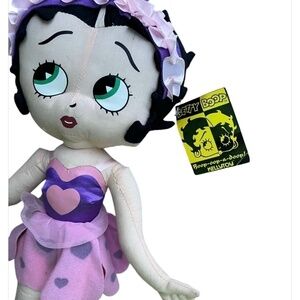 Betty Boop Love Bug plush doll from the 2011 Kellytoy Valentine’s Day Collection. This 10-inch plush doll features Betty Boop in a purple and pink heart-themed outfit, complete with heart antennae and a matching wand. New with tags in excellent condition.