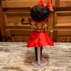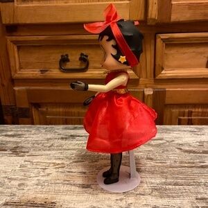 Vintage 1986 Marty Toy Dancing Flapper Betty Boop doll, nicknamed “The Flapper.” This doll embodies the 1920s flapper era. Betty wears a bright red dress with a matching red hat and shoes, and a red bow on her head. This Betty Boop doll features wide eyes and a sweet expression.
