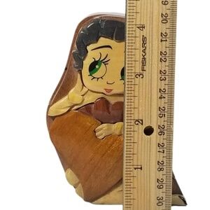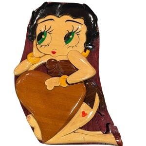 This is a 1990s Betty Boop puzzle box, beautifully handcrafted. This piece combines artistry and functionality and is perfect for collectors.