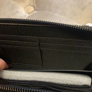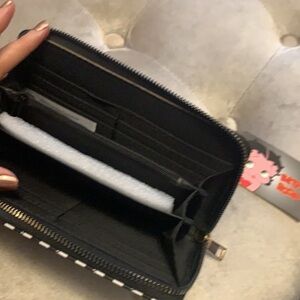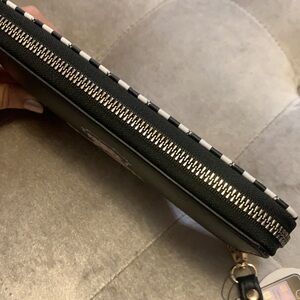 Brand new Betty Boop black and white striped wallet wristlet. Has removable black strap that makes it a wristlet, gold hardware. Gold zipper closure that opens to six card slots on one side, section for change, an open section for cash bills and then six card slots on the other side. Great item for any Betty Boop fans, great gift. Brand new with tags, never used.