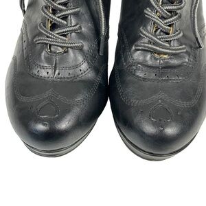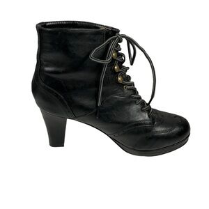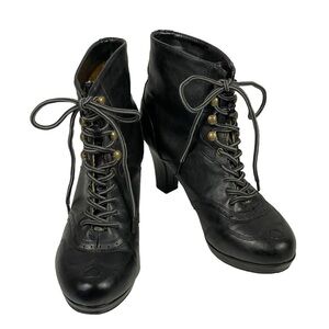 Cute granny style ankle boots. Not sure of the material but I believe they are faux leather. Approx heel height 3.25 inches with front platform by toes 1/2 inch. Lovely condition with one dent on one heel, see picture.