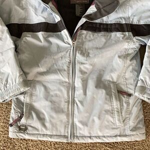 This jacket is light blue with dark gray denim accents. It is perfect for snowboarding or skiing with an attached hood. Lots of zippered pockets and snow protection elements. I have tried to photograph everything that you need to make an informed decision.