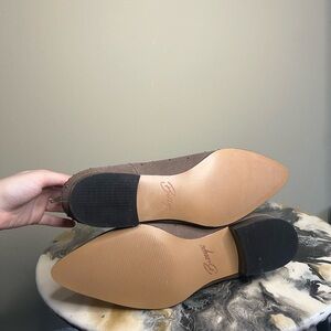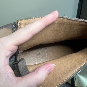 Beautiful genuine leather suede upper in a neutral gray taupe color. Bronze circular studs embellish the boot. Back zip. Have never been worn, new without box. Size US 7.5.