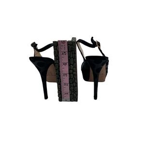 These stylish black heels feature a chic slingback design with an open back and a rounded closed toe embellished with a decorative polka dot pattern.