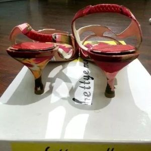 Beautiful magenta floral print kitten heels by Bettye Muller! Trying to clean out my closet! New in the box, only worn once for a photo shoot! Such a pretty open-toe heel. Perfect to wear this summer with dresses and skirts! Heel is approximately 2.5". Great deal on designer shoes, you're going to love them!