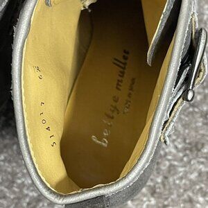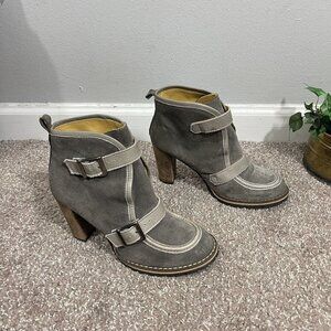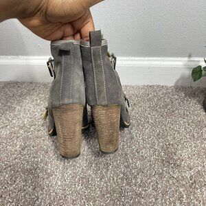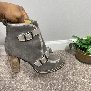 Bettye Muller Gray Suede Leather Ankle Boots Stacked Heel Combat Moto 37 US 6.5