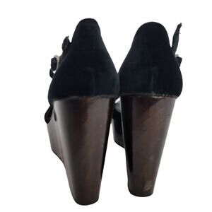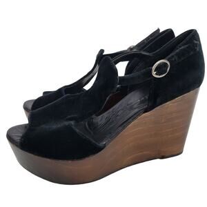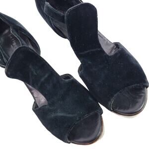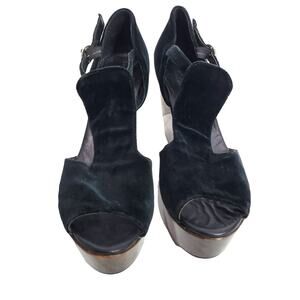 Bettye Muller Heel Wedge Black Velvet Platform Wood T Strap Peep Toe Chunky 9.5