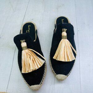 Gorgeous made in Spain espadrille mule slides crafted from textile and leather; adorned with a tassel to reminisce oriental slippers.