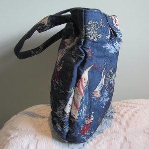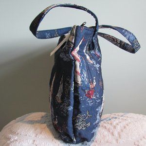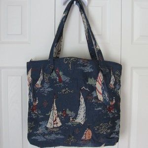 Gorgeous tote bag with regatta theme. Quality tapestry fabric on exterior. Interior is black fabric with one open pocket. Top of bag has zipper closure.