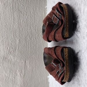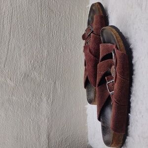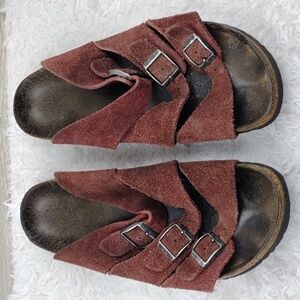 Betula Licensed by Birkenstock Women's Burgundy Suede Leather Upper Open Toe Three Five Hole Buckled Strap Cork Footbed Slide Sandals. Rubber Sole. Leather Footbed. Suede Wear/Marks. Footbed Wear/Open Crease Per Photos. Size 40/US 10 Women's 9/9.5. Men's 40/US 7/7.5 Color May Vary Due To Lighting.