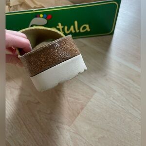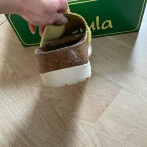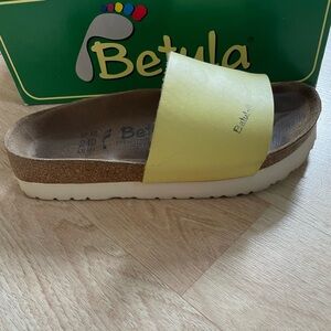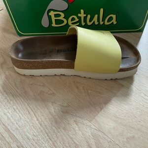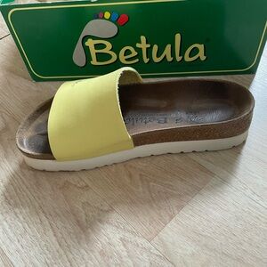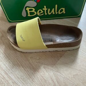 EU 37 yellow with cork footbed platform slide sandals. Well loved but lots of life left. Minor signs of wear as indicated in photos. Glue is lifting slightly on heel of right footbed. Betula licensed by Birkenstock Reggae sandals.