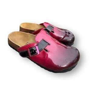 Tags: shiny slip on cork footbed comfort glossy ombre pink to black gradient bright cherry red bohemian hippie statement arch support y2k retro boston patent
