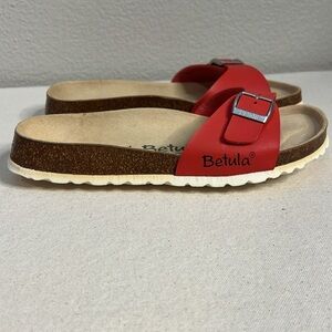 Gorgeous Betula by Birkenstock red slide sandals with adjustable buckle strap. Size 37 (EU), fits like a US Women’s 6 / Men’s 4.5. These have never been worn outdoors — soles are pristine. I honestly can’t remember ever wearing them, but there is a small mark on one buckle (see close-up). Comfortable cork footbed and classic white Birkenstock-style tread.