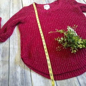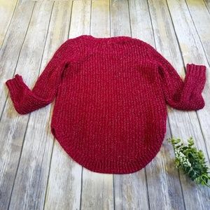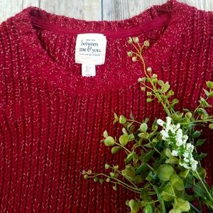 Between Me & You Red Sweater with gold thread details. Size Large. Beautifully chunky and well made. No flaws other than a few small pulls on gold threading. No rips or stains. Perfect for fall into the holiday season. This sweater will be versatile for all of your comfy needs. Wether that is stuffing your face with Christmas cookies and stretchy pants or just laying in a crying heap during a Netflix binge watching session of Hallmark movies. Ask all questions prior to purchase. Offers welcome!