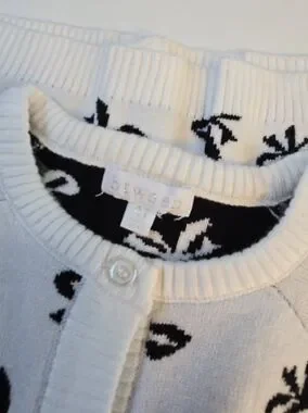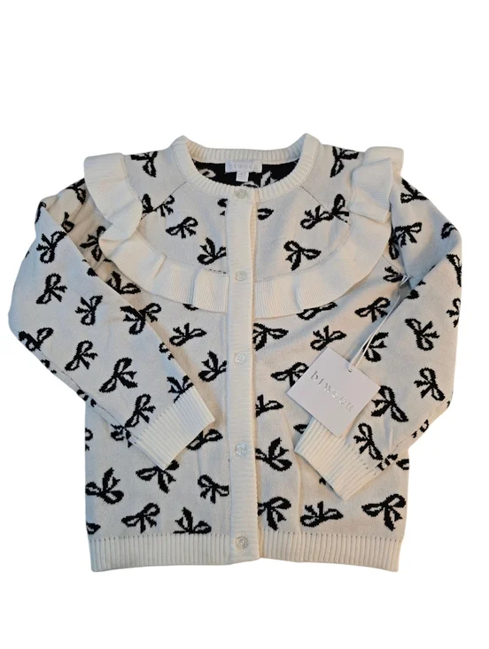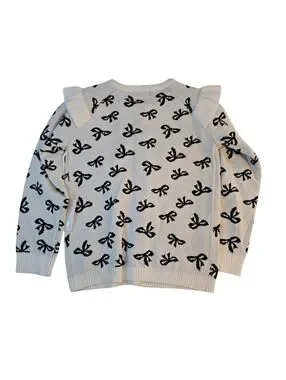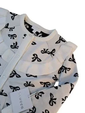 Between ruffle-front cardigan in white with black bow motif. Soft knit with button-front closure and decorative ruffle at the yoke. Versatile, stylish layering piece for everyday wear.