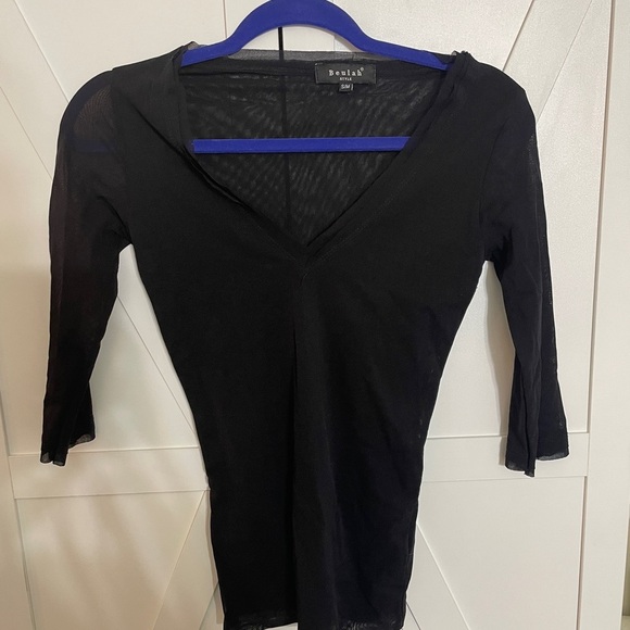 Chic black mesh blouse with a flattering V-neck. Perfect for versatile styling.