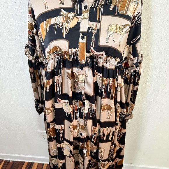 Chic long sleeve dress with equestrian print. Stylish and comfortable for any occasion.