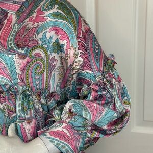 Chic paisley dress with button-up design. Features pink and blue patterns dress in good condition