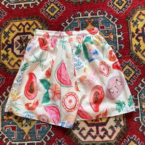 Bring playful vibes to your summer wardrobe with these Beulah-style fruit print shorts. Featuring a vibrant tropical pattern with watermelon, papaya, and other colorful motifs, these shorts are designed with an easy pull-on elastic waistband and a relaxed fit. Perfect for beach days, vacations, or casual warm-weather looks.