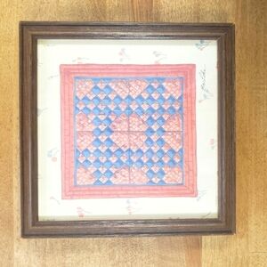 Beautiful Vintage framed quilted wall art featuring a pink and blue pattern. Perfect for adding a touch of charm to any room.