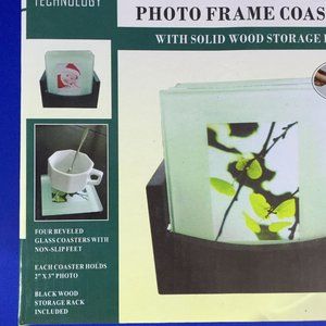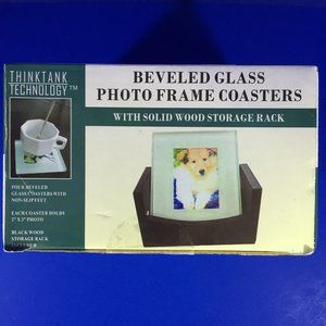 Beveled Glass Photo Frame Coasters with a Solid Wood Black Storage Rack