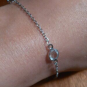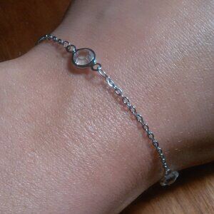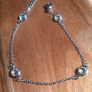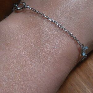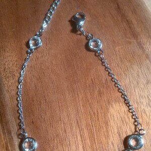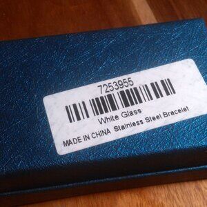 This station bracelet is features a chain link design and beveled white glass stones. The bracelet is stainless steel and has an adjustable length of 7.5 to 9 inches. Brand new.