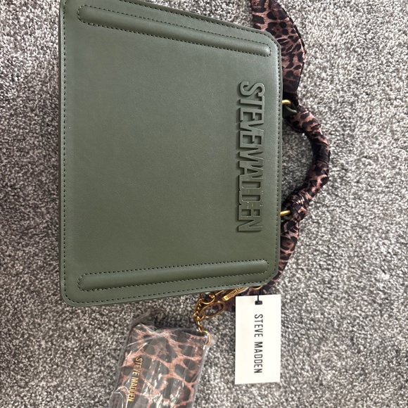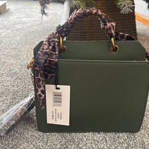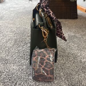 An army green colored handbag with gold accents and a leopard printed handle with a matching wallet.