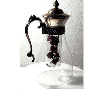 Ther server is likely intended for serving water or other beverages, and the silver-plated elements add an elegant touch, it could also be used as a decorative piece, as seen in the image with dried roses inside.