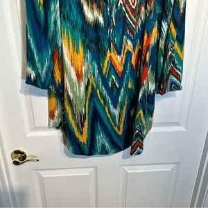 Beverly Drive peasant style top with three quarter sleeves that have elastic around the ends and a split vneck that ties in the front