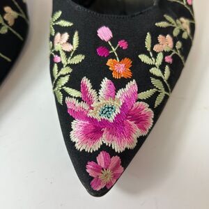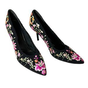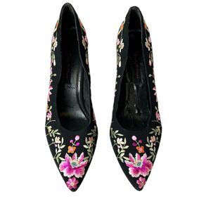 Beverly Feldman Black Floral Embroidered Point Toe Stiletto Heel Pumps Size 10M