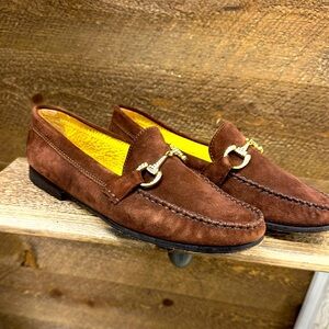 Elevate your classic look with these luxurious Beverly Feldman loafers. Crafted in rich brown suede with a standout gold and crystal bit detail across the vamp, these driving-style shoes are the perfect mix of timeless and glam. The interior pops with a signature metallic gold leather lining, offering comfort and statement-making flair.