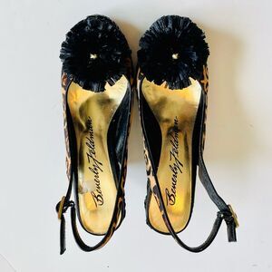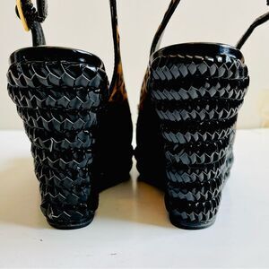 This patent leather and Leopard print wedge wedge is a showstopper. There is so much detail to this shoe unlocking braided patent leather heels and adorable Pom Poms at toes.