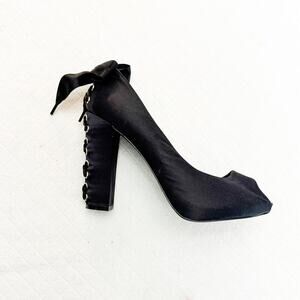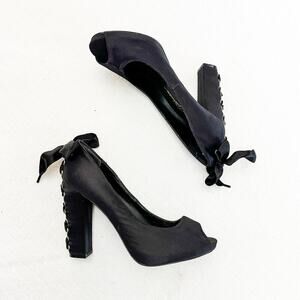Beverly Feldman Satin Lace Up Peep Toe Heels Pump Bow Back Detail Size 8.5
