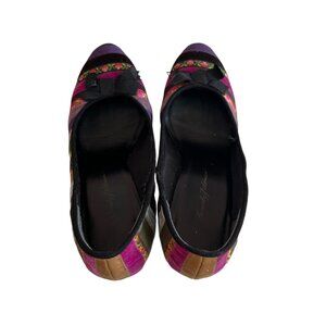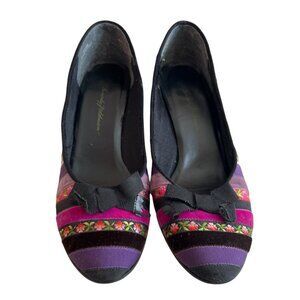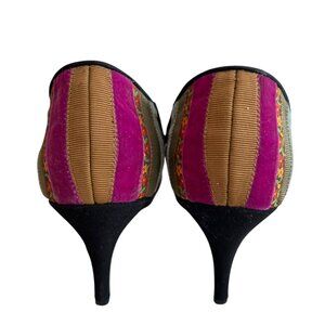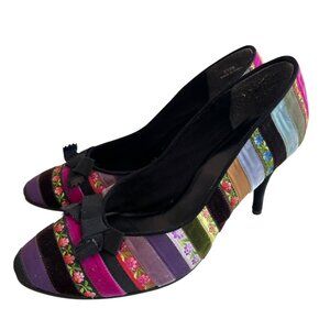 Beverly Feldman high heel shoes, multicolor ribbon stripes, bow, slip on, leather soles, 3.5" high heel, US 8.5, preowned and shows wear on the soles - see photos