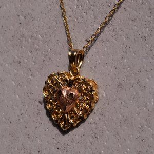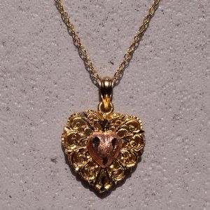 The 187th Street: Beverly Hills Gold Signed Two Tone Heart Pendant. The 3/4 inch pendant features a textured rose gold heart shaped center with scrolled filigree outside in yellow gold. The pendant is crafted in 14 karat rose and yellow gold and is hallmarked by Beverly Hills Gold. A chain can be added in your desired length for an additional charge on request and is photographed with one for display purposes only.