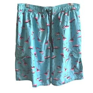 flamingo swim trunks, Beverly Hills Polo Club, men’s swim shorts, tropical print shorts, beachwear, mesh lined swim trunks, aqua blue shorts, vacation shorts, pool party trunks, novelty swimwear, large swim shorts, summer swim trunks, quick dry shorts, men's board shorts, tropical flamingo shorts