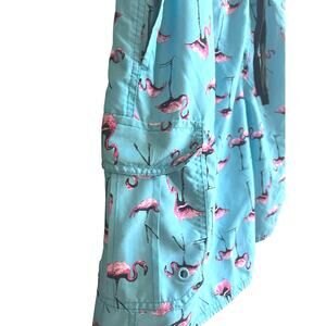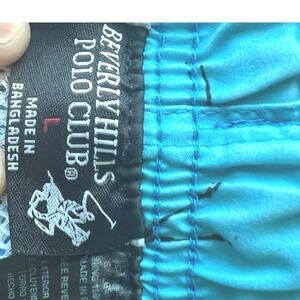 Make a splash in these bold Beverly Hills Polo Club swim trunks with a fun pink flamingo print on aqua blue. Size Large with mesh lining, elastic waistband, and drawstring for comfort. Features side pockets, cargo pocket, and back pocket. Quick-dry polyester—perfect for beach days, vacations, or poolside lounging.