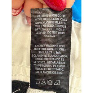 0446B- Beverly Hills Polo Club Men’s swim trunks/cargo shorts, M, Sky blue, white trim. Made in Bangladesh.1.5” elastic waist with white drawcord. Side, double stripes, side slit mesh pockets and inside lining, . Two cargo pockets with embroidered logo on left pocket flap, with grommets accents. Soft; right back hip welt pocket with hook and loop closure. Shell and lining: 100% polyester.