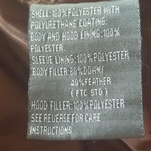 This jacket has a lot of features. Removable hood with cinch closures, three inner pockets, two outer pockets. Fleece lining. 60% down and 40% feather for super warmth. Rich chocolate brown.