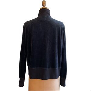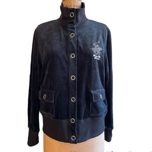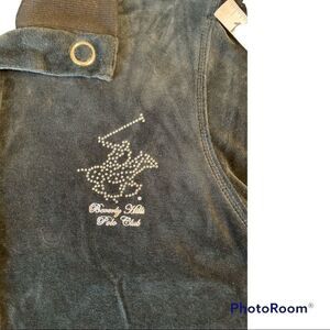 Black velour bomber style jacket with broad ribbing at waist, collar and cuffs. Sparkly studded Beverly Hills Polo Club logo, large stud snap fastening and patch pockets.