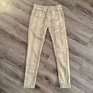 Shely Style with a Tie. Sand Cobra print. 98% cotton 2% Lycra. Machine washable. Does not Wrinkle or Fade. Comfortable, Stylish, Very Flattering. Wear with Sneakers, Sandals, Booties, Heels. Wear it Casual or Dressy for Evening. Try them and you will see why these pants have been the #1 selling item in boutiques all around the U.S. Inseam: 30", Rise: 11".