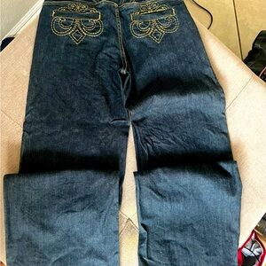 From Beyonces clothing line House of Dereon that dropped in 2004. Still in beautiful flawless like new condition. Only worn once or twice. Beautiful Floral Satin lining on waist and gold embellishments and details. Dark denim… wide leg.