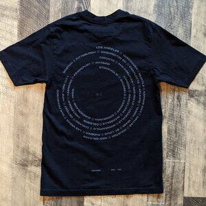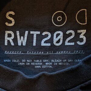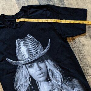 This is a Beyonce t-shirt in black. It is in excellent condition. It is a size small, and the last three images show measurements. Ribbed crewneck, short sleeves, 100% cotton, big front graphic of Beyonce wearing a disco ball cowboy hat, big back graphic of all the tour’s cities in a spiral.