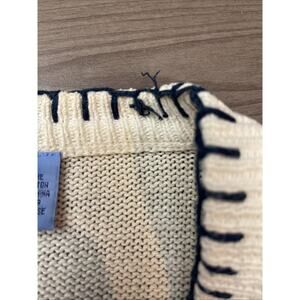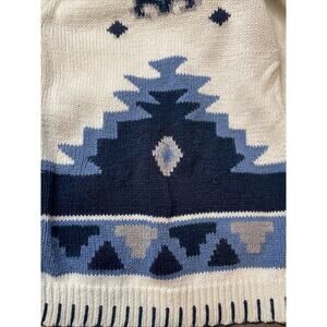 There a fee stains as shown. The Vintage Beyond Blue Sweater Cardigan in Cream/Blue-Southwestern design is a stylish and unique piece crafted from Ramie Cotton material. This long sleeve cardigan is perfect for women who appreciate a Western theme in their wardrobe. The combination of cream and blue colors adds a touch of sophistication to this vintage sweater, making it a versatile addition to any outfit. Easy to care for with machine washable instructions, this cardigan in size M is sure to become a timeless favorite in any woman's closet.