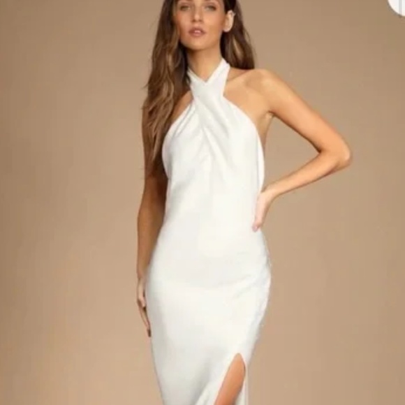 Low back, smooth soft fabric that is lined and not see-through. Slit on leg and adjustable halter neck closure. Never worn and just like new. Size small. MIDI length, mid shin length on me and I am 5’7