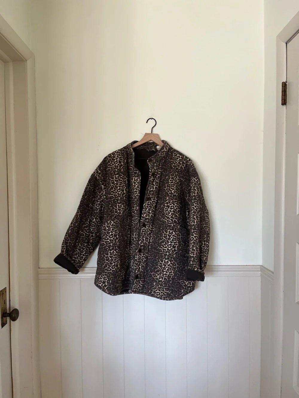 I love this jacket I just don’t wear leopard print! Size s/m but very oversized, fits me with room at a size large.