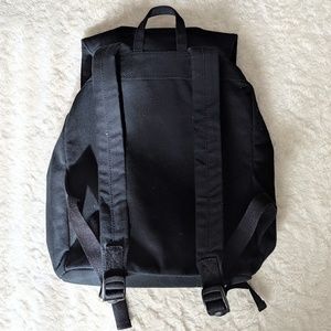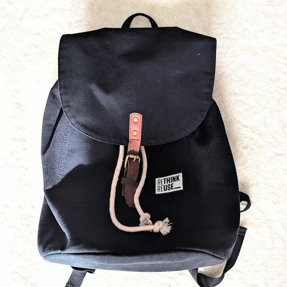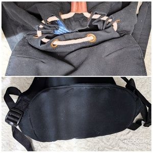 This vintage style canvas backpack features a rope drawstring, leather buckle fastening and brass tone hardware