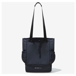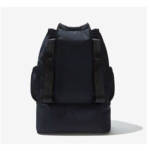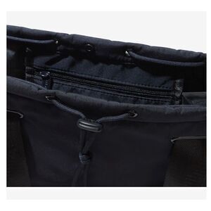 Features: Drawstring, snap closure, small inside zipper closure, bottom zipper compartment; can be worn as a backpack